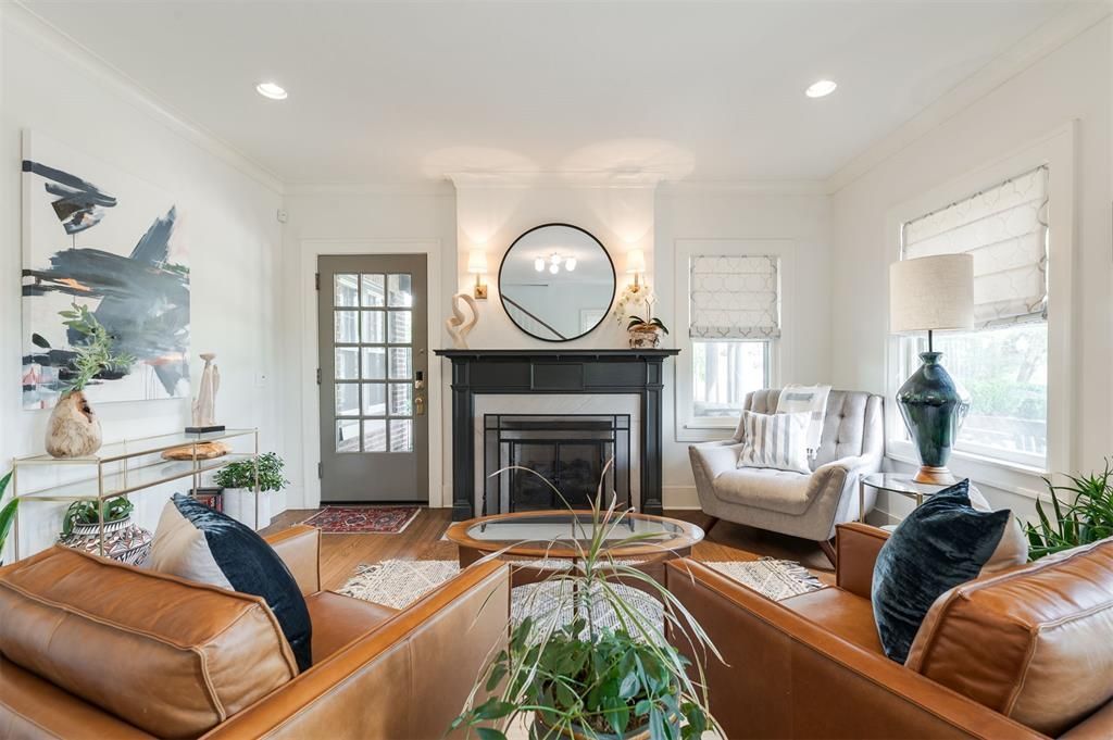 Archetypal Heritage Hills Elegance. Perched atop one of the most recognizable lots in all of Oklahoma City, this distinguished Colonial estate radiates refined style. Mature trees and plantings envelop the lush lawn evoking a park-like setting. The stately front entrance ushers you into a warm, light-filled living room anchored on one side by the charming gas-log fireplace. A glass door to the side porch streams light across the gleaming wood floors and leads you past the staircase with double-height ceilings and a stunning powder bath tucked underneath to the timeless dining room, off of which sits a large study and neatly placed wet bar as well as a hallway to the ground floor bedroom and full bath. The stunning kitchen offers easy luxury with marble surfaces, brass fixtures, a Sub Zero refrigerator and a Bertazonni professional grade 36 range and vent hood. The sumptuous velvet-cushioned breakfast nook invites guests to linger. A well proportioned butlers pantry lends more work space and storage and leads thru to the generous covered deck and basement access. Upstairs, discover a second floor living room complete with its own fireplace and balcony with views to Downtown OKC. This gathering spot and a bright bedroom share the full hallway bathroom. The primary bedroom is a true retreat with a stunning ensuite, updated to a high standard. Carerra marble adorns the floors, shower and counter tops of the primary bath which boasts a soaking tub and separate vanities.The private backyard is meticulously maintained and features a large covered deck as well as a flagstone-paved patio with fire pit and hot tub. The two car garage, accessed by car directly from Walker Ave and contains a 484sf, beautifully finished guest annex with deck.All updates including HVAC, interior plumbing and sewer lines, roof & electrical are from 2018-2019. A SWAT Mosquito system, whole house generator and tankless water heater were also added at that time.